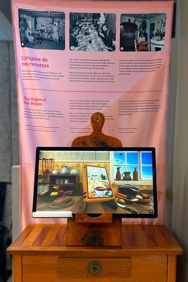 L'application interactive navigable sur écran tactile permet à l'utilisateur de découvrir les recettes du livre numérique Grandma's Kitchen Table de manière intuitive du bout des doigts, en plus de donner accès à des contenus vidéos et textuelles complémentaires sur les recettes et l'histoire des Îles de la Madeleine.