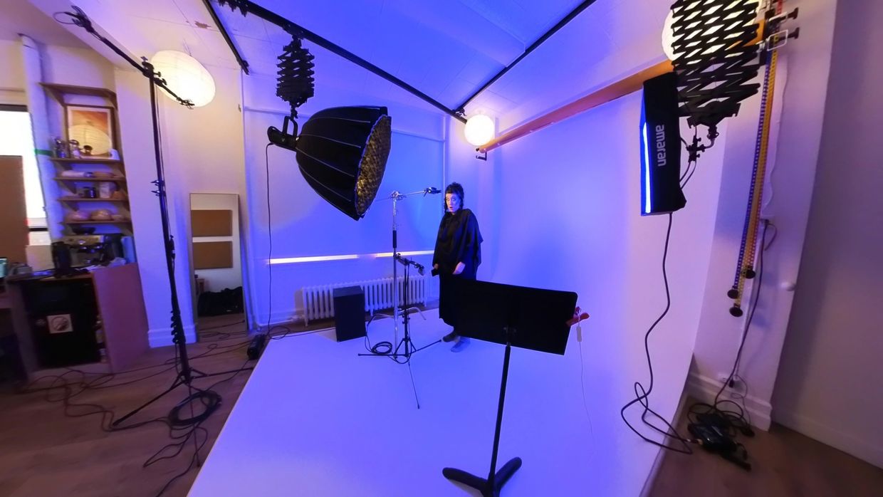 Session d'enregistrement audio et vidéo en studio de la section vocale de l'opéra "Belle nuit, ô nuit d'amour". La captation vidéo a servi de base pour la création d'un effet de capture volumétrique du visage de la chanteuse.
